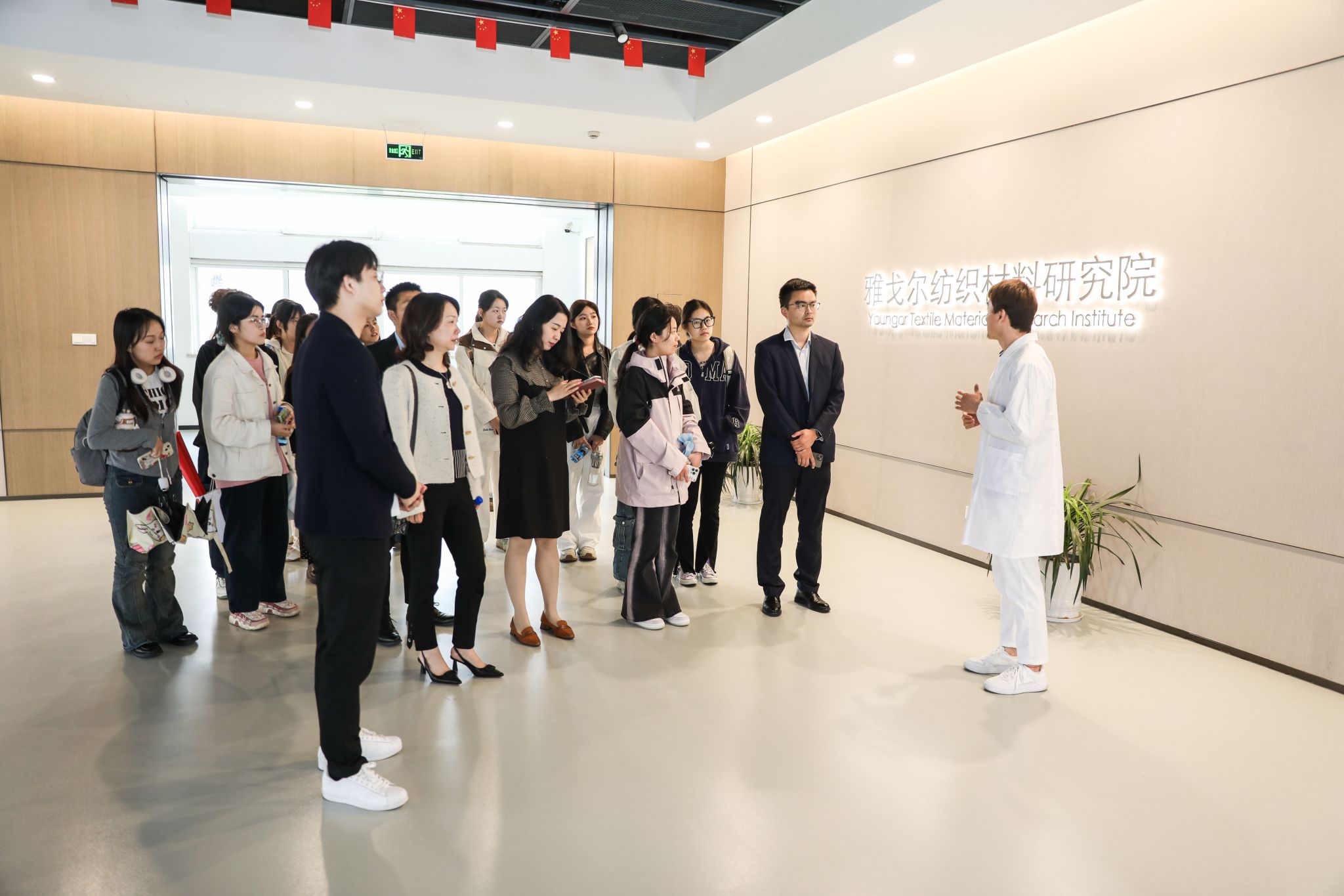 紧接着,俞华清校友带领大家参观了雅戈尔纺织材料研究院。校友们亲眼见证了研究院在功能性纺织材料应用、成衣后整理技术研发等方面的成果。通过参观纺织材料研究院,他们对雅戈尔在科技创新和品质控制方面的实力有了更深入的了解。