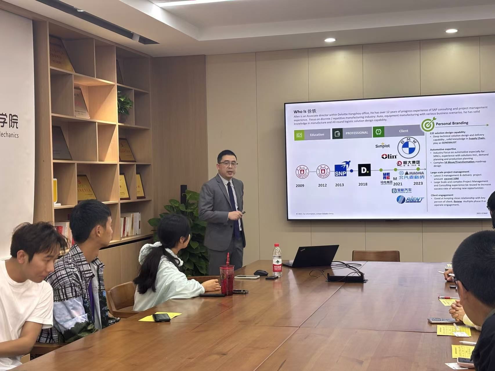 活动伊始,徐轶校友亲切地进行了自我介绍,瞬间拉近了与学弟学妹们的距离。他分享了自己从校园走向职场的成长历程,以及在职场中不断挑战自我、追求卓越的心路历程。随后,徐轶校友对德勤中国进行了详细介绍。他提到,德勤作为全球领先的审计、税务、咨询和法律服务机构,一直致力于为客户提供高质量的专业服务。在德勤,他见证了无数专业人才的成长与蜕变,也深刻体会到了团队合作与创新精神的重要性。