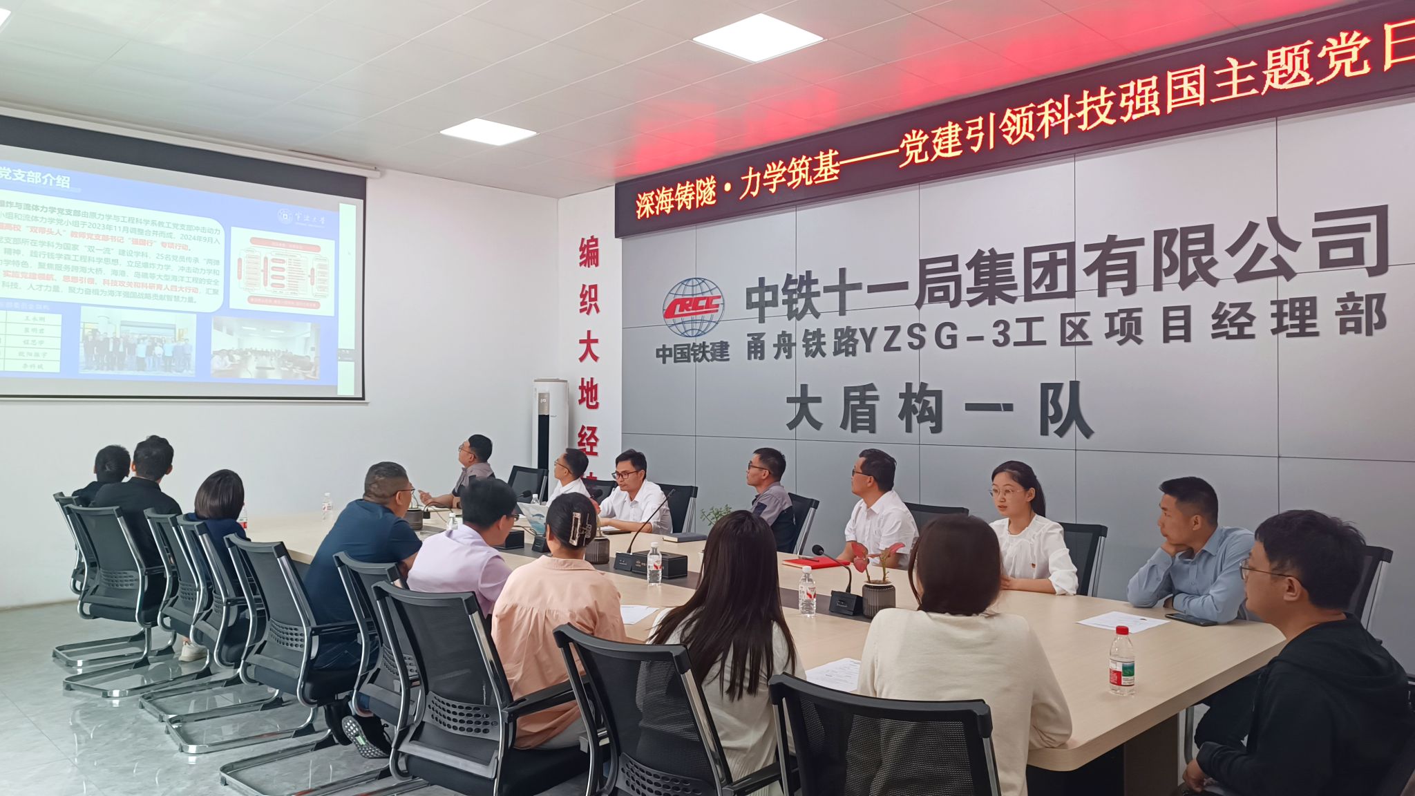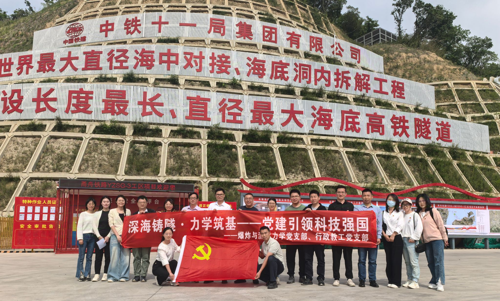 为高质量推进“强国行”专项行动,5月7日下午,全国高校“双带头人”教师党支部书记“强国行”专项行动团队——爆炸与流体力学教师党支部联合行政教工党支部赴中铁十一局集团有限公司甬舟铁路项目部开展“深海铸隧·力学筑基——党建引领科技强国”主题党日活动。双方围绕党支部共建、甬舟铁路金塘海底隧道建设的技术挑战与科研合作等方面展开深入探讨,并实地参观了世界级跨海工程——甬舟铁路海底隧道施工现场。