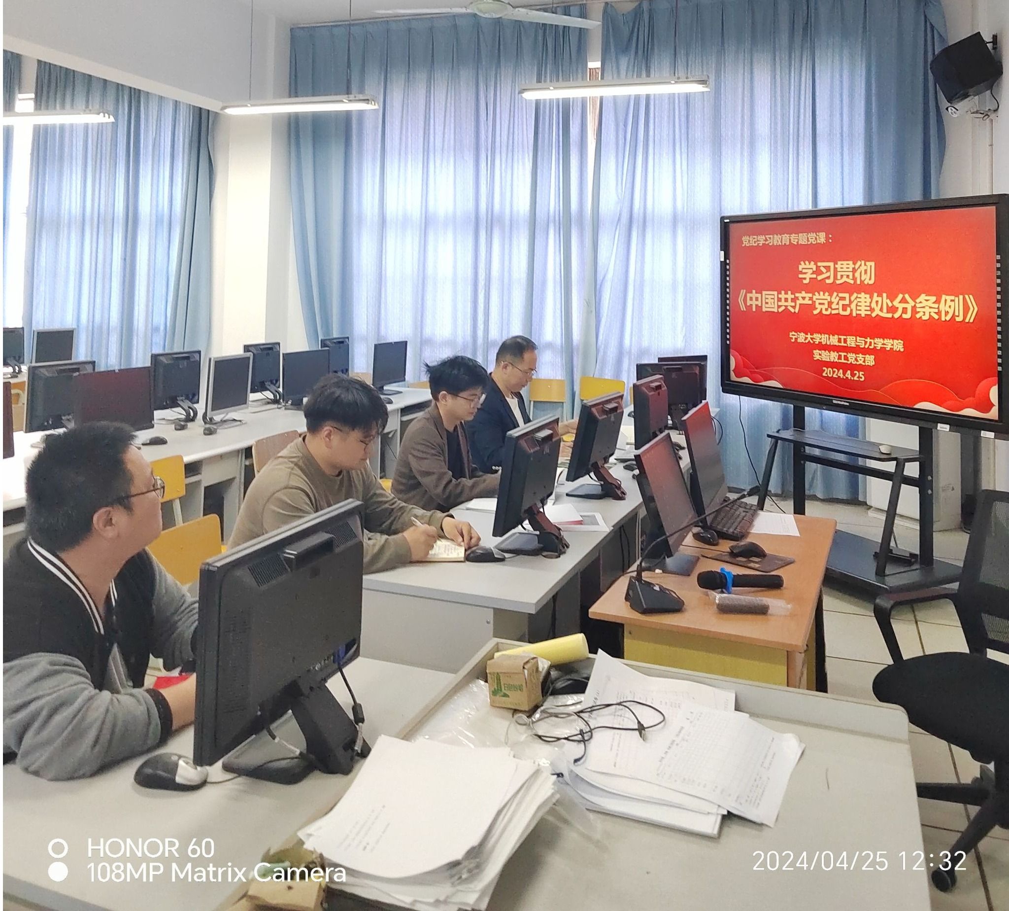 4月25日中午,机械91麻豆实验教工党支部组织党员在机电工训中心二楼机房召开集中学习会,集体学习《中国共产党纪律处分条例》。