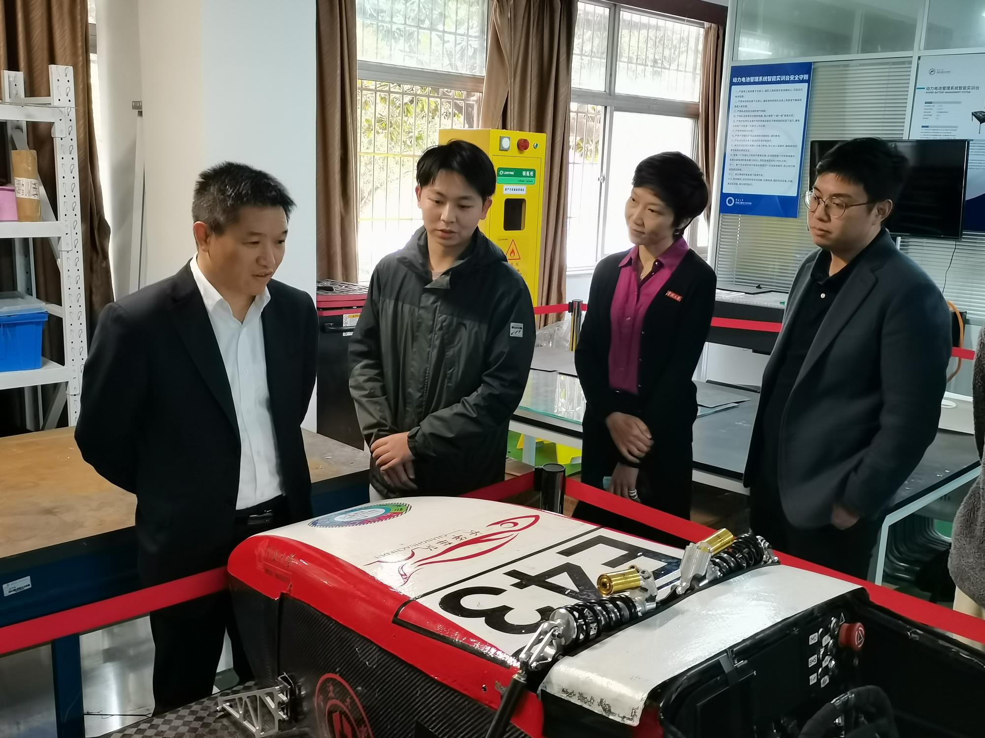 首先,吕副校长前往3号教学楼翱翔车队基地参观指导。社团负责人首先介绍了社团建设情况,对社团最新研制、组装完成的电车进行了详细汇报;社团指导老师沈涛汇报了社团学生的培养情况,从社团走出的同学无论就业还是升学,都深受高校和企业的青睐。吕副校长充分肯定了同学们取得的成绩,对同学们将所学知识与实践动手充分结合的学习方式给予了肯定与鼓励,同时给出了更多的期望,希望同学们与其他学生社团、专业相关企业加强交流,把翱翔车队建设成为专业社团的样板,来年取得更多更高的成就。他表示,同学们在专业知识学习之外有自己的兴趣爱好十分重要,有利于同学多方面、多维度地提升自身的综合素质。