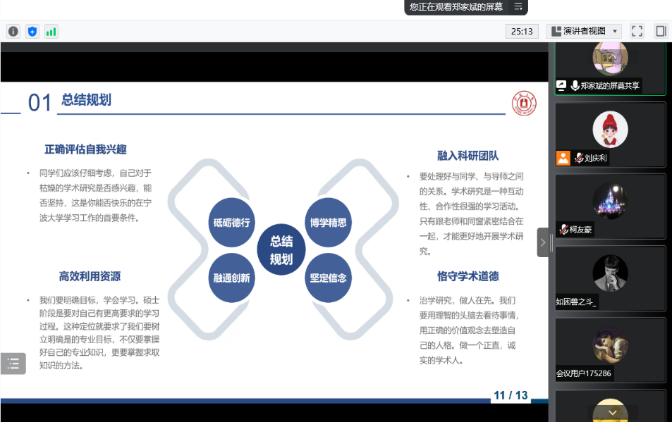 最后主持人刘庆利同学作简要总结,他希望同学们借鉴学长们的经验,在研究生生涯中不断提升自己的科研素养,培养独立思考问题、分析问题、解决问题的能力。同时也祝福各位同学们能够更加充实地度过美好的研究生生活,在宁大这个大舞台上施展自己的才华。在宁大,不负青春,不负韶华!