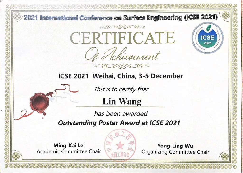 二年级硕士生王琳代表团队做的题目为“Heteroepitaxial Growth Related to Impact Melting and Mechanical Interlocking in Ceramic Metallization Using Cold Spraying”的海报,获大会“杰出海报奖”。