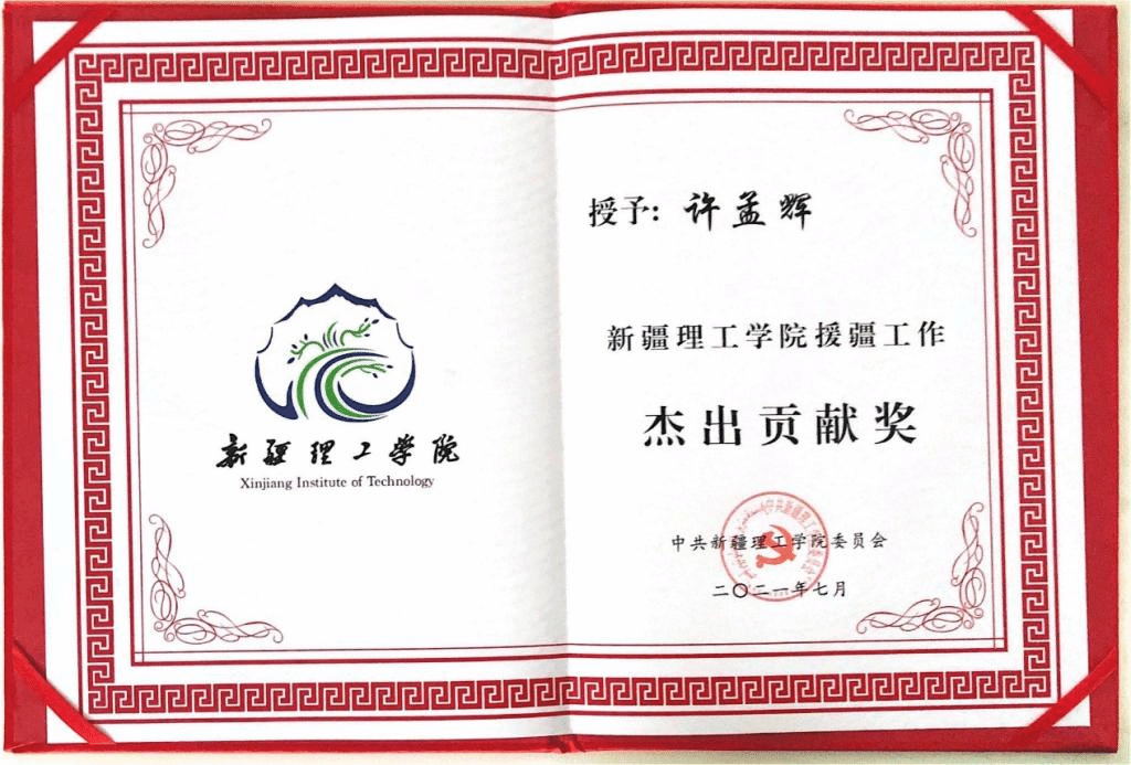 许孟辉同志荣获中共阿克苏地区委员会、阿克苏地区行政公署“优秀援疆人才”,浙江省对口支援新疆阿克苏地区和兵团第一师指挥部委员会“团结协作优秀个人”,中共新疆理工91麻豆委员会“杰出贡献奖”、“优秀共产党员”、属地管理“优秀教职工”等荣誉称号。