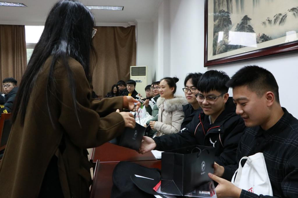 紧接着书记院长将亲笔书写的寄语贺卡,递交到每位考研学生代表手里,预祝他们能在即将到来的研究生考试中旗开得胜、金榜题名!随后由就业指导中心和学生会成员为他们送上暖心助考礼品。当他们收到学院精心准备的爱心助考“十八件套”,围上红围巾时,现场气氛达到高潮,从他们脸上洋溢着的自信的笑容中,可以看出每个学生都感受到了来自学院的温暖,也做好了最后的冲刺准备。