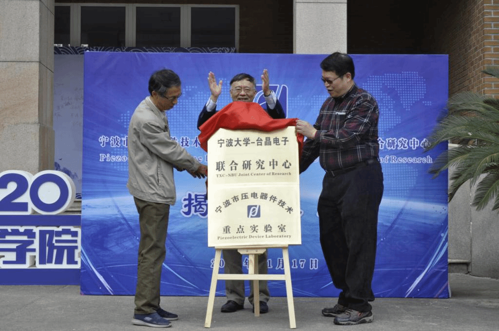 执行院长郑荣跃教授和台晶(宁波)电子有限公司赵岷江总经理共同揭牌。机械学院杜建科教授、材化学院陈红兵研究员、中科院宁波材料所方省众研究员,台晶电子公司研发团队,以及压电实验室全体师生参加活动,共同见证了波大学-台晶电子联合研究中心的成立。