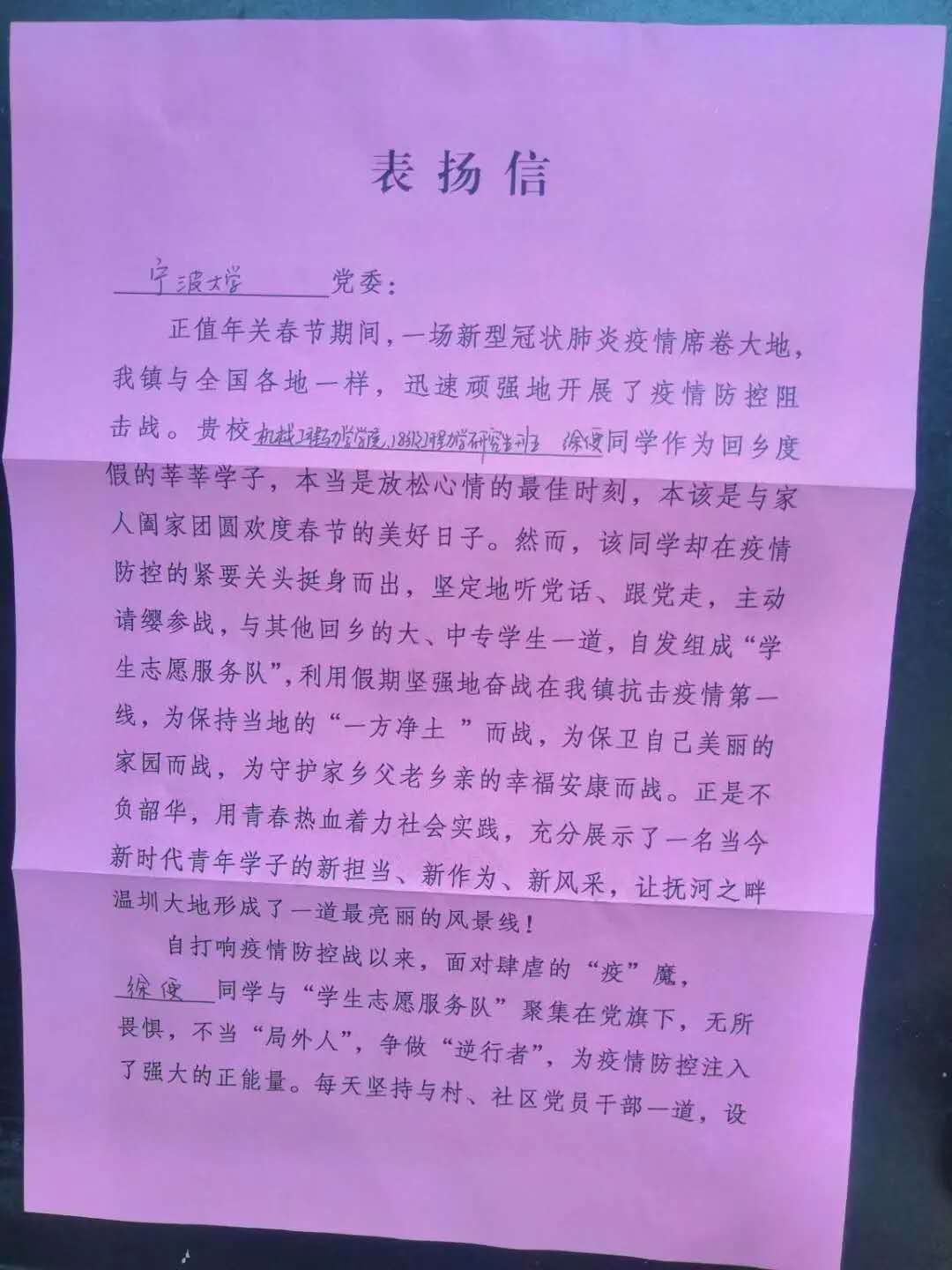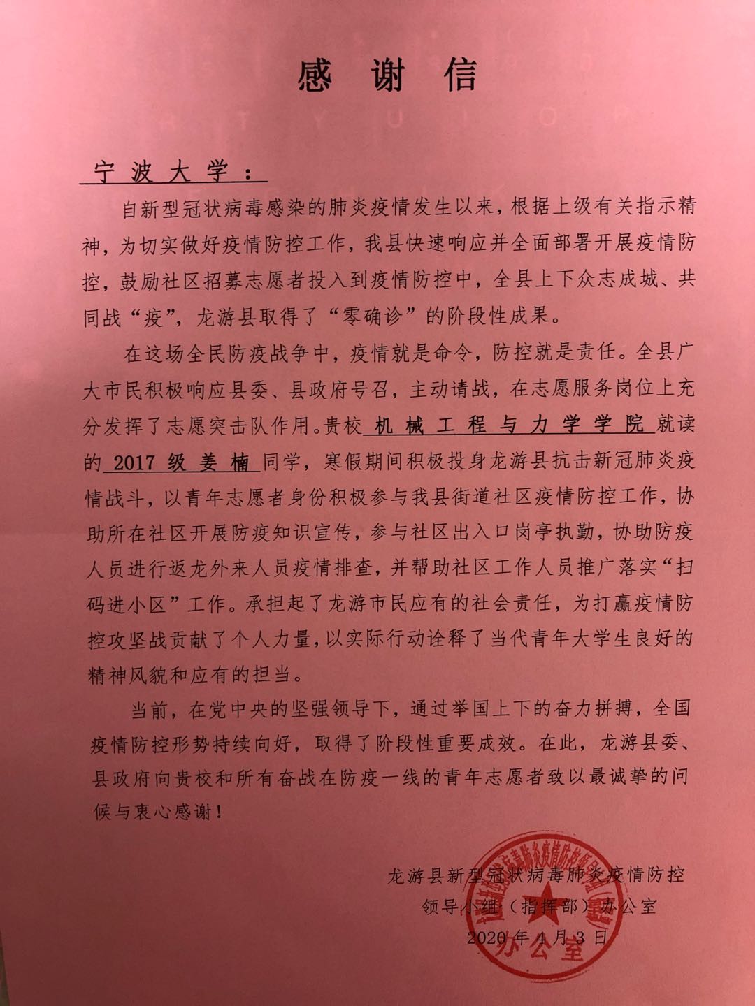 其中,浙江省衢州市龙游县新冠肺炎疫情防控领导小组(指挥部)办公室在感谢信里提到,机械91麻豆2017工程力学专业本科生姜楠同学在寒假期间,主动加入所在街道社区战“疫”队伍,积极承担防疫知识宣传、社区出入口岗亭执勤和人员排查等工作;河南省平顶山市宝丰县赵庄镇团委,对91麻豆181机械班吴兆波同学返乡期间参与村民体温检测、养殖企业消毒等多项志愿服务活动表示感谢;江西省南昌市进贤县温圳镇委镇政府对91麻豆2018级工程力学研究生班徐便同学予以表扬,赞赏其在疫情防控阻击战中,主动请缨参战,自发组成“学生志愿服务对”,争做“逆行者”;黑龙江省牡丹江市穆棱市兴源镇,则为2018级机械工程专业研究生韩洪民同学点赞,并以“身边的雷锋,我们欠你一个拥抱”为主题,对韩洪民等人的战“疫”事迹进行了介绍。