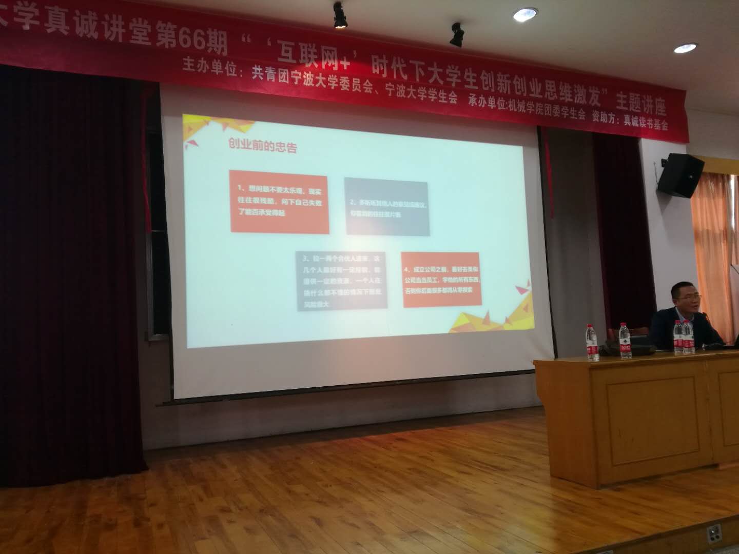 为帮助在校学子树立知识产权保护意识,了解专利申请流程,4月19日下午,宁波大学真诚讲堂第66期“‘互联网+’时代下大学生创新创业思维激发”主题讲座在绣山工程楼三楼报告厅举行。