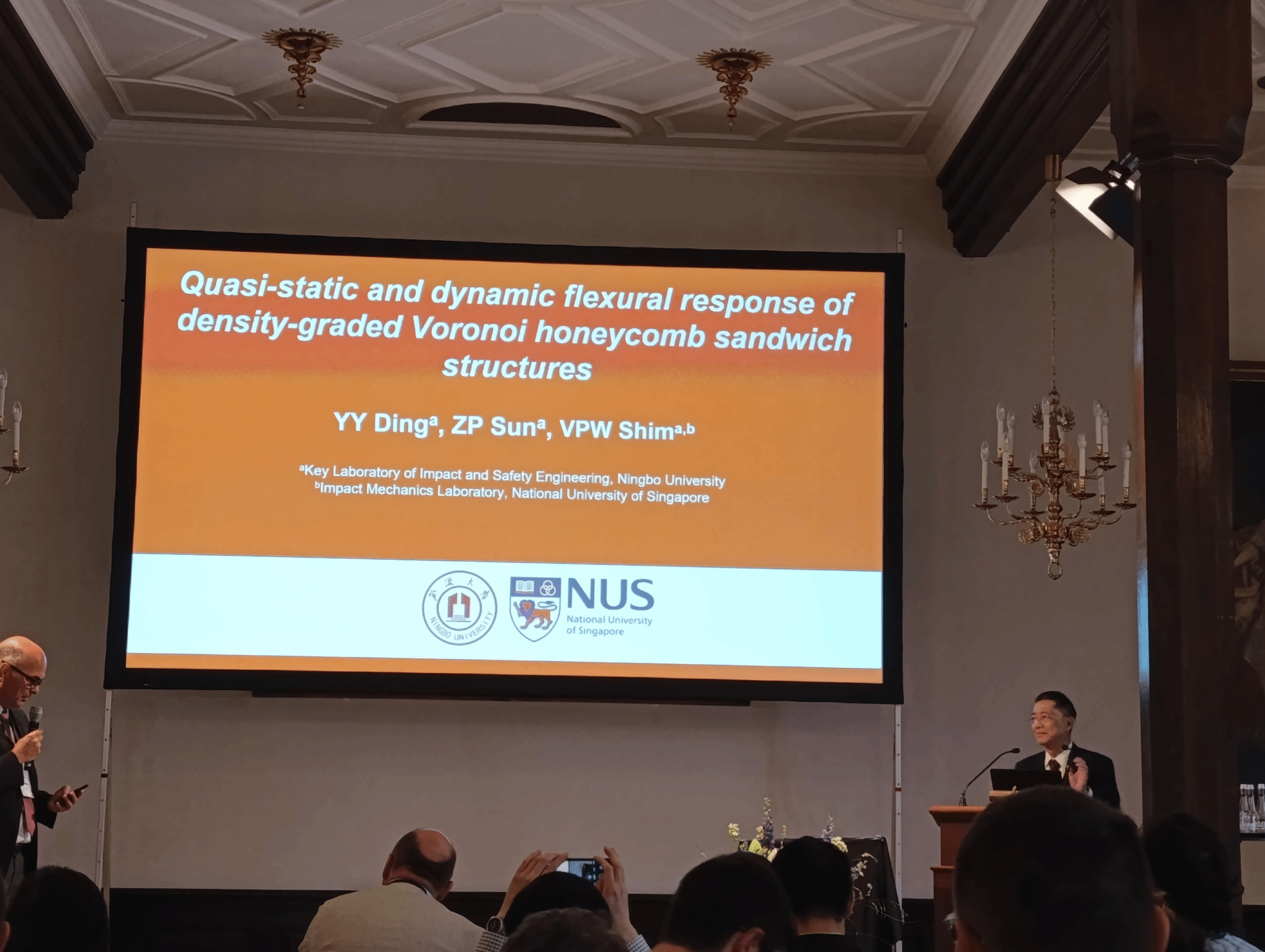 是唯一一家受邀出席本次会议的国内单位,重点实验室Victor Shim教授在大会上作了题为“Quasi-static and dynamic flexural response of density-graded Voronoi honeycomb sandwich structures”的报告,总结了在重点实验室同丁圆圆老师和孙正平博士合作完成的工作。该报告受到了参会者广泛关注,多名参会者向Shim教授反馈了对该工作和大会报告的高度评价。其中,一位来自德国布伦瑞克大学的学者同Shim交流了在该领域的研究进展,并且表达了双方深入开展学术交流合作的意愿。