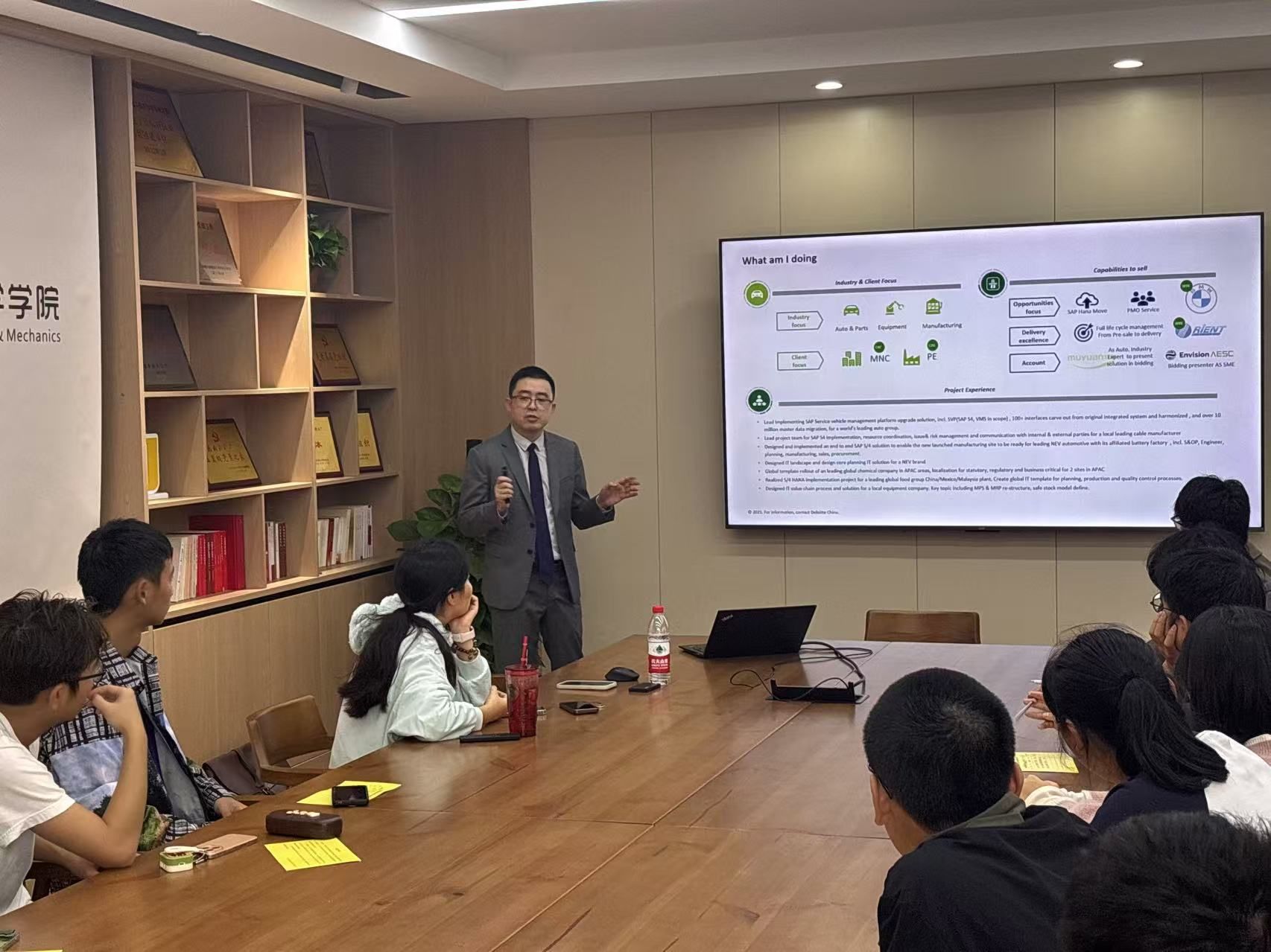 活动伊始,徐轶校友亲切地进行了自我介绍,瞬间拉近了与学弟学妹们的距离。他分享了自己从校园走向职场的成长历程,以及在职场中不断挑战自我、追求卓越的心路历程。随后,徐轶校友对德勤中国进行了详细介绍。他提到,德勤作为全球领先的审计、税务、咨询和法律服务机构,一直致力于为客户提供高质量的专业服务。在德勤,他见证了无数专业人才的成长与蜕变,也深刻体会到了团队合作与创新精神的重要性。