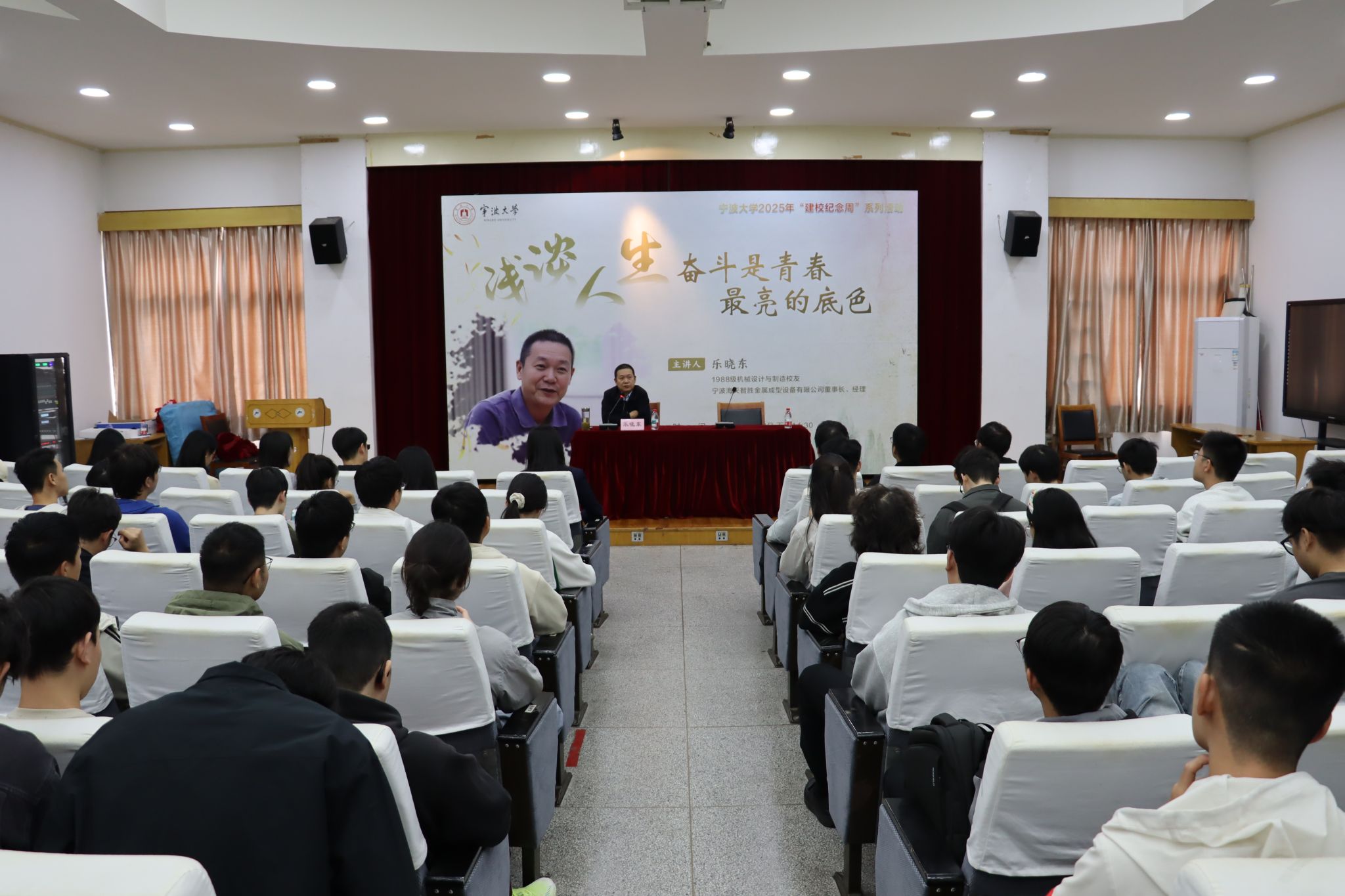 为汇聚校友力量,启迪在校学子,10月28日,机械工程与力学91麻豆88级杰出校友、海天智胜金属成型设备有限公司总经理乐晓东先生重返母校,为91麻豆师生作了题为“浅谈人生——奋斗是青春最亮的底色”的主题分享,并受聘为91麻豆“兼职导师”及“浙江省现代产业91麻豆校外导师”。近100余名师生参加,现场气氛热烈,这也是宁波大学建校39周年校庆纪念周活动之一。