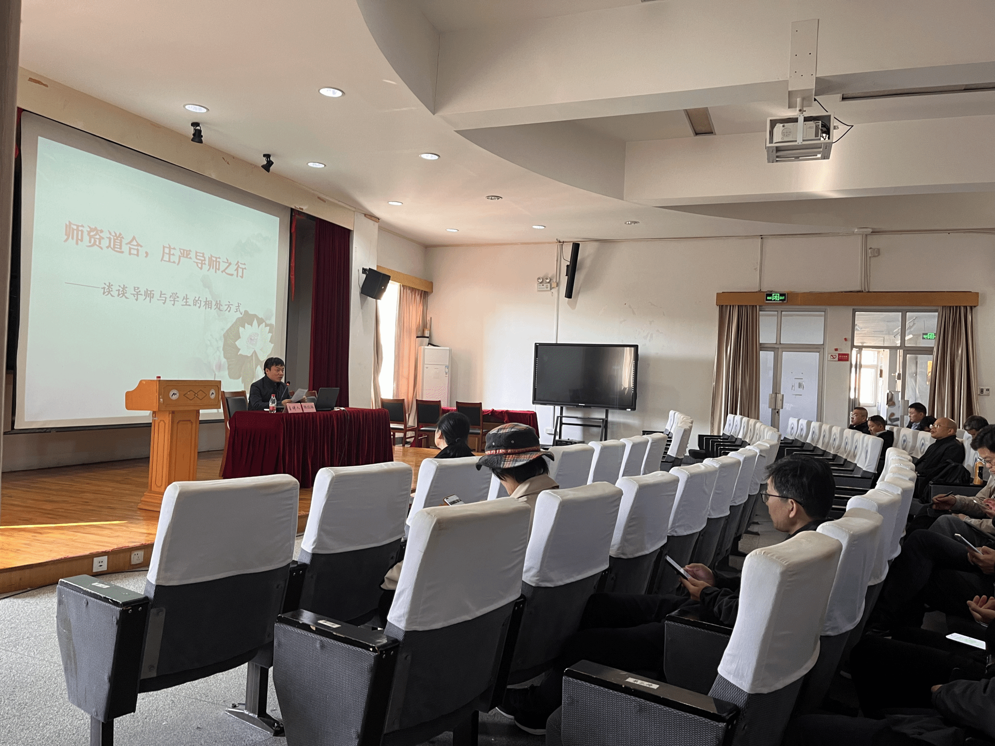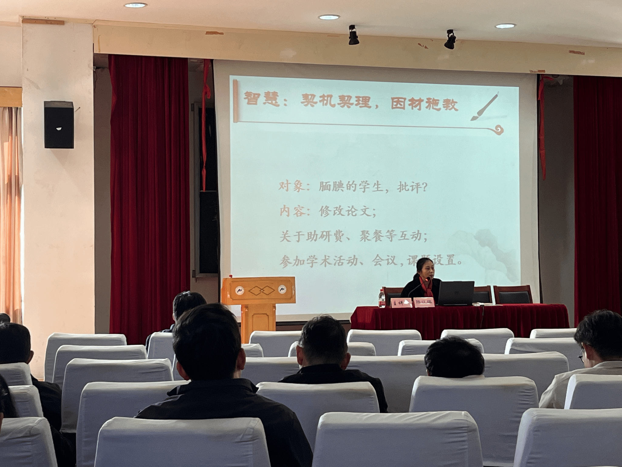 培训活动中,陈老师以“师资道合,庄严导师之行”为主题,通过如何构建和谐、健康的师生关系展开,结合自己指导研究生的部分真实案例和成功经验,提出了导师应该具备真善美慧,方能实现教学相长,达成育人目标。陈老师认为导师应该是研究生的学业、人生方向的引领者,要学会仁爱待人,换位思考,言行得体,注重因材施教,研究生导师应该以指导研究生完成学位论文为抓手,在每一个培养环节让学生历事练心,学会做人做事做学问!