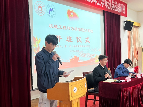 学生入党的培训工作,深化党的基本理论知识及教育,同时为更好贯彻落实主题教育要求,引导广大党员“学思想、强党性、重实践、建新功”,5月8日,机械学院在绣山工程楼三楼报告厅举行第28期预备党员培训班、第13期发展对象、第35期积极分子培训班开班仪式,院党委书记王智腾、学院专职组织员褚慧丽、各学生党支部书记和本期党校学员参加了开班仪式,会议由党建辅导员余杰主持。