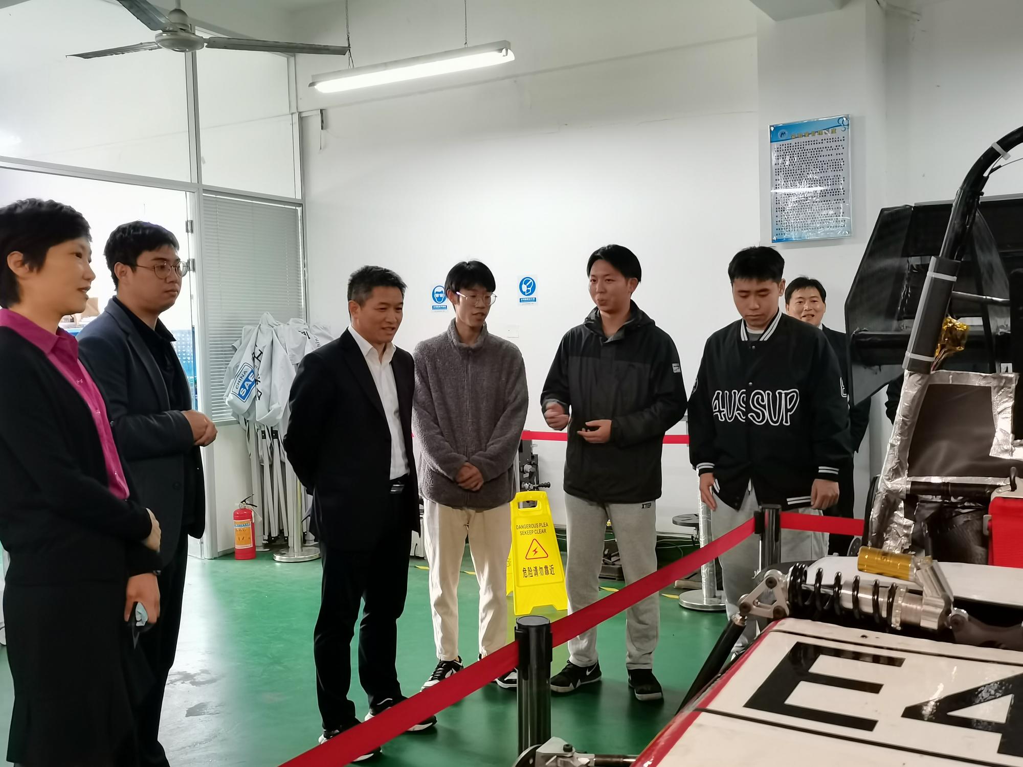 首先,吕副校长前往3号教学楼翱翔车队基地参观指导。社团负责人首先介绍了社团建设情况,对社团最新研制、组装完成的电车进行了详细汇报;社团指导老师沈涛汇报了社团学生的培养情况,从社团走出的同学无论就业还是升学,都深受高校和企业的青睐。吕副校长充分肯定了同学们取得的成绩,对同学们将所学知识与实践动手充分结合的学习方式给予了肯定与鼓励,同时给出了更多的期望,希望同学们与其他学生社团、专业相关企业加强交流,把翱翔车队建设成为专业社团的样板,来年取得更多更高的成就。他表示,同学们在专业知识学习之外有自己的兴趣爱好十分重要,有利于同学多方面、多维度地提升自身的综合素质。