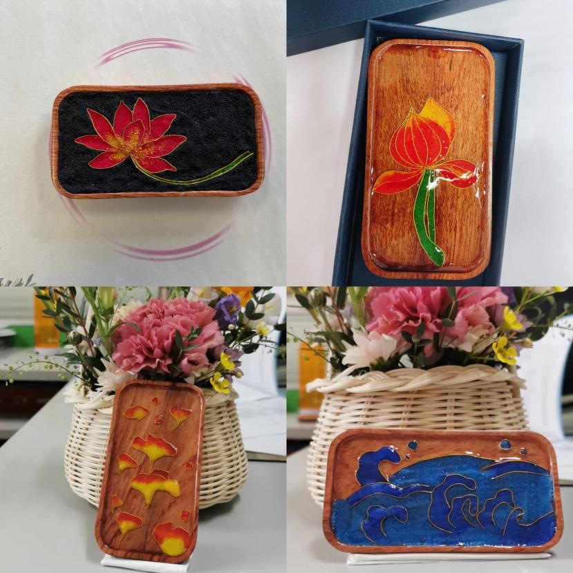 在特邀的非遗老师指导下,女教工们认真学习了“珐琅掐丝”这一传统工艺,一根根细铜丝在老师们的手里被细心掐出了不同的形状,一段段花纹又在小小的木质杯垫上勾画出了一幅幅美妙的图案,再经细沙填充赋予色彩,最后通过烧制固定成膜,变成了一件件独一无二的手工艺术作品。