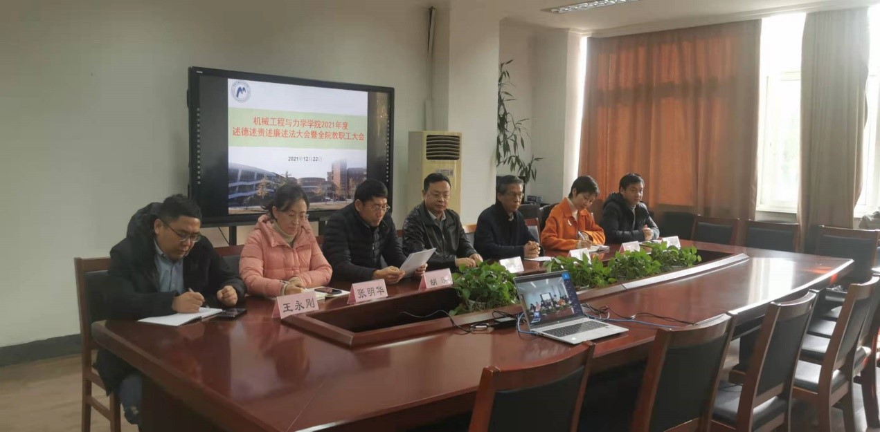 12月22日下午,机械学院2021年度述德述责述廉述法大会暨全院教职工大会在绣山工程大楼208会议室召开。受疫情影响,学院党政领导和系/中心主任、副主任参加了现场会议,其余教职工参加了钉钉线上视频会议。本次会议由党委书记胡泓主持。