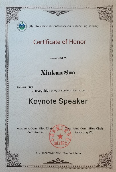 多维增材制造研究所所新坤教授,曹均博士等一行6人参加会议。其中所新坤教授受邀担任热喷涂分会场主席并受邀做主旨报告,李锦棒博士和二年级硕士生王琳分别获得大会颁发的“杰出海报奖”。