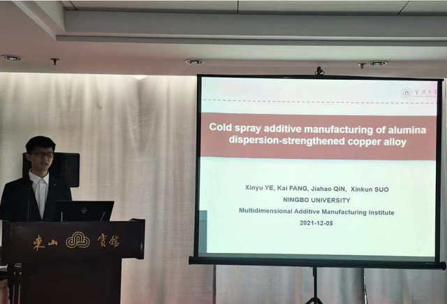 一年级硕士研究生叶鑫宇代表团队作了题为“Cold Spray Additive Manufacturing of Alumina Dispersion Strengthened Copper Alloy”的口头报告。