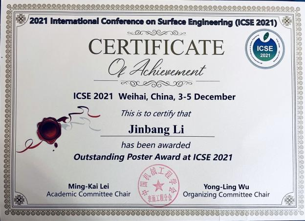 二年级硕士生王琳代表团队做的题目为“Heteroepitaxial Growth Related to Impact Melting and Mechanical Interlocking in Ceramic Metallization Using Cold Spraying”的海报,获大会“杰出海报奖”。