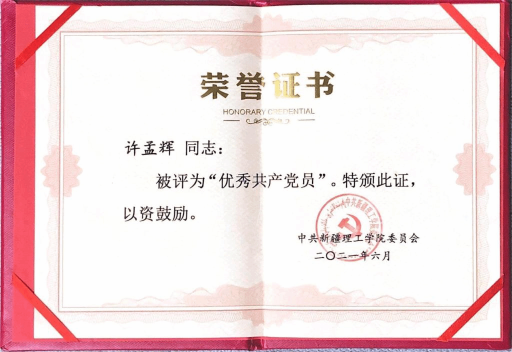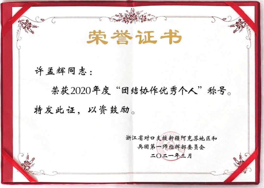 许孟辉同志荣获中共阿克苏地区委员会、阿克苏地区行政公署“优秀援疆人才”,浙江省对口支援新疆阿克苏地区和兵团第一师指挥部委员会“团结协作优秀个人”,中共新疆理工91麻豆委员会“杰出贡献奖”、“优秀共产党员”、属地管理“优秀教职工”等荣誉称号。