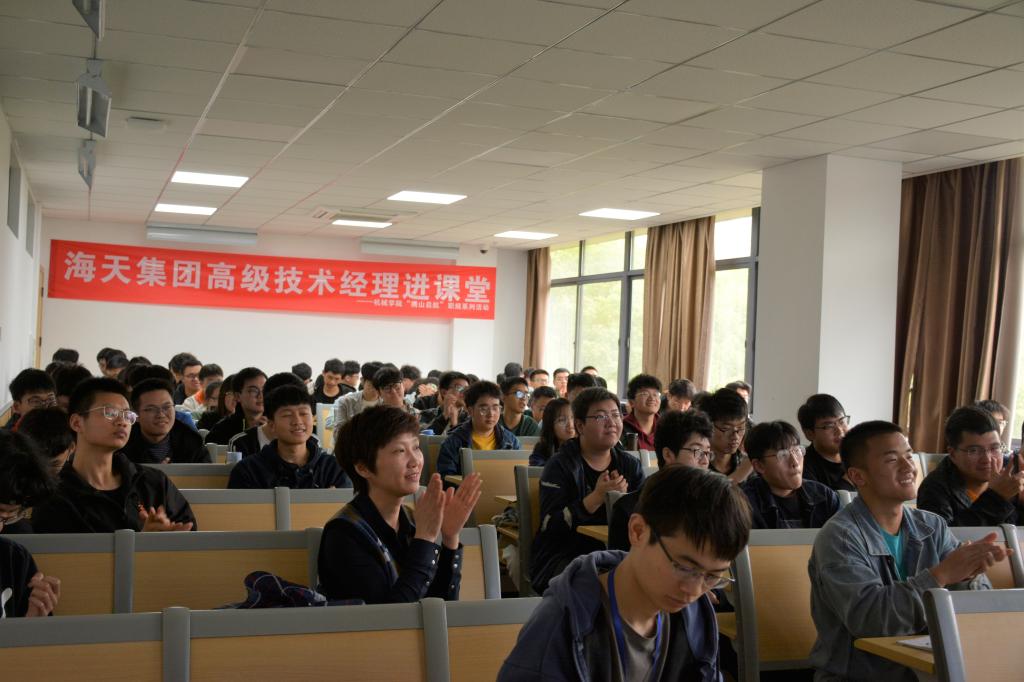 在“海天集团高级技术经理进课堂”讲座中,张程斐以酱油为切入点,与同学们充分互动,调动了同学们对于海天集团的兴趣。随后焦晓龙从塑料加工机械的角度入手,介绍了机械行业的发展现状以及海天的产业布局发展状态。随后焦晓龙谈到,如果以领域强相关专业进入职场,那么其发展路径是多元的,既可以钻研某一项技术,专心沉淀,也可以涉猎多项技术,拓宽发展方向。最后焦晓龙以自身职业感悟出发,从学习、责任、选择、价值、目标等方面给同学们的职业规划提了很多建设性建议。