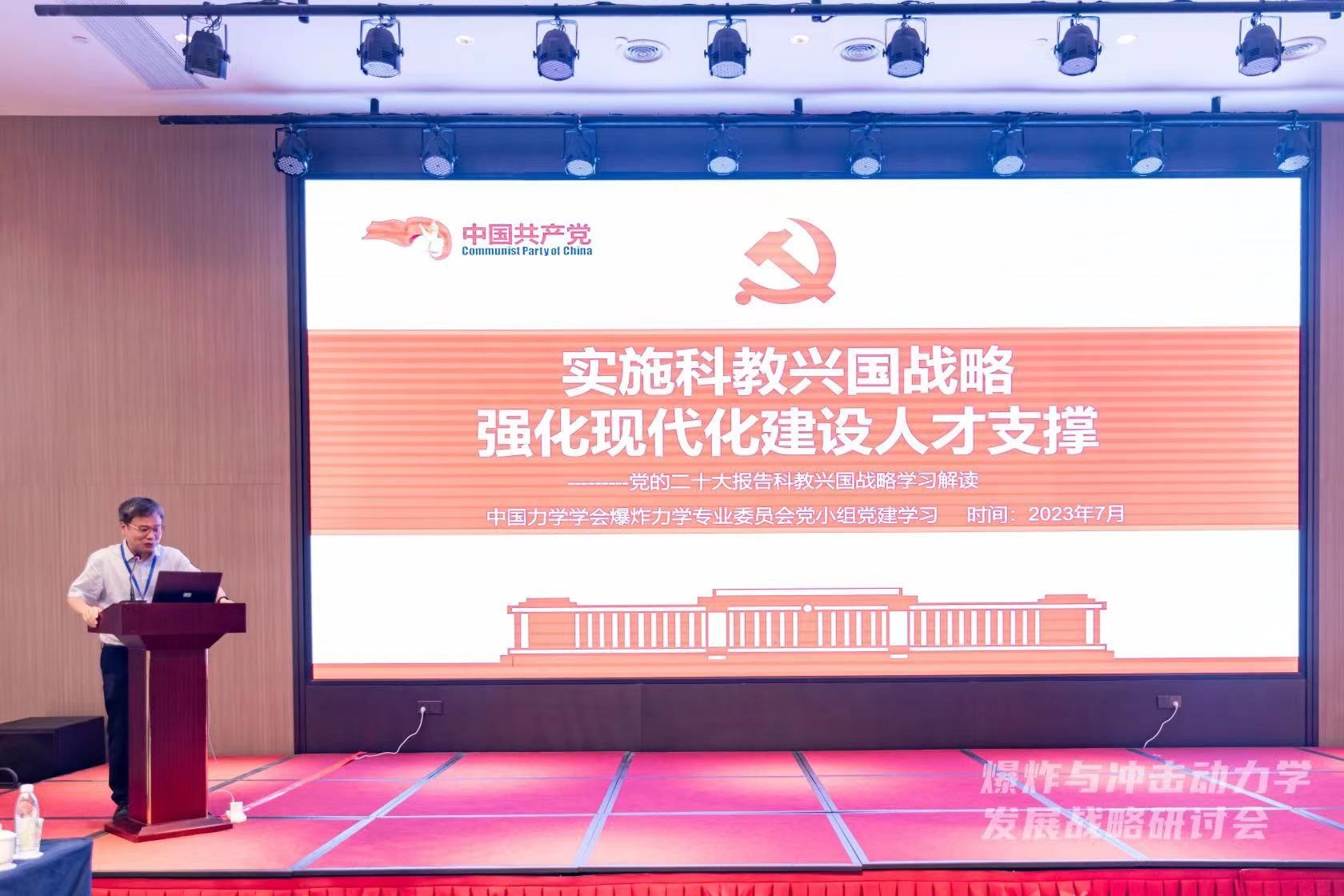 王礼立教授向参会代表们赠送新出版的《应力波基础》第三版,并带领大家回忆了钱学森所长60年前的讲话(线上),学习钱学森先生的无私奉献和爱国爱党精神,中国科学院合肥物质科学研究院党委书记黄晨光研究员带领大家学习解读了党的二十大科教兴国战略,王成教授主持了党员学习环节。
