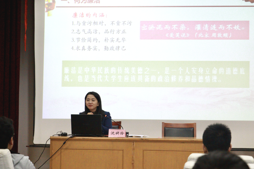 在绣山工程大楼三楼报告厅举办学院分党校廉洁教育专题党课,发展对象、预备党员培训班学员参加。党课由学院党委副书记、纪委书记沈妍伶担任主讲。