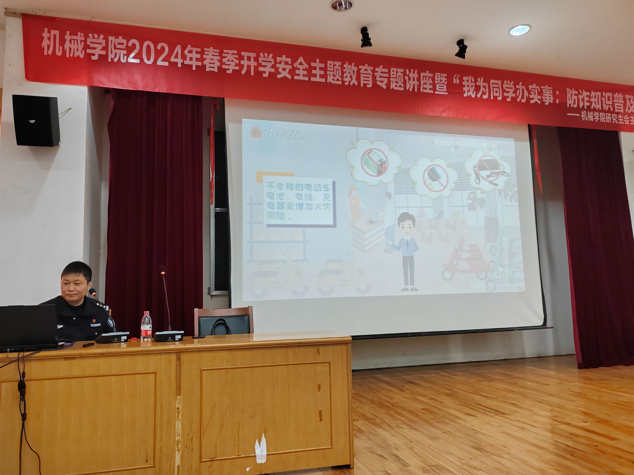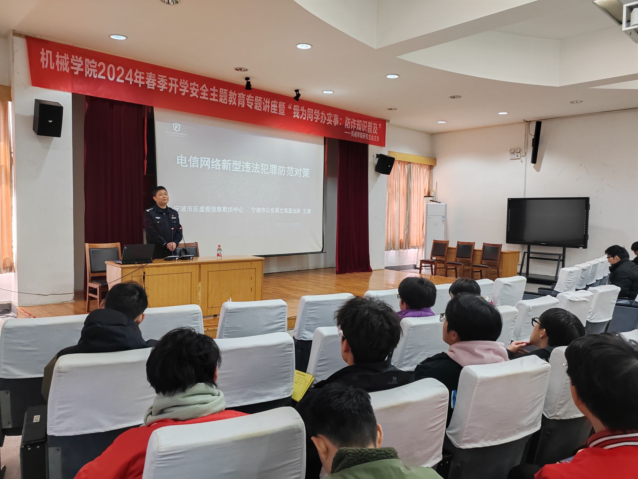 为认真落实上级部门通知精神,加强春季开学校园安全稳定工作,3月8日下午,机械学院在绣山工程楼三楼报告厅举行2024年春季开学安全主题教育专题讲座暨“我为同学办实事:防诈知识普及”活动。来自全院本研各班级的150名学生代表现场聆听。