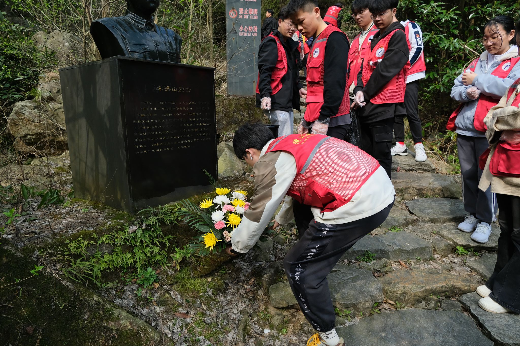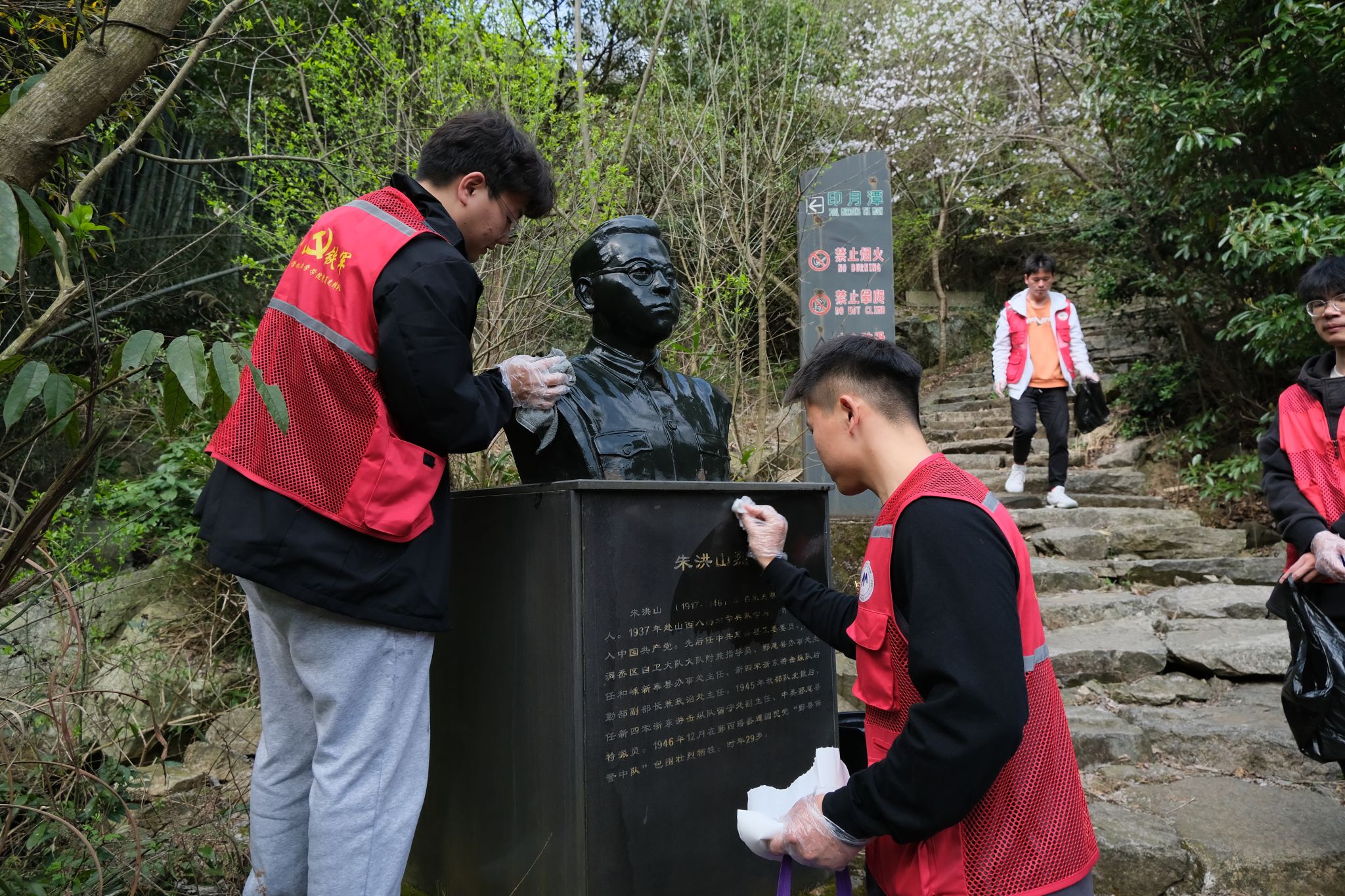 沿着古道,拾级而上,透过绿树山涧,能看到一位位烈士塑像巍然矗立,志愿者们怀着对先烈的崇高敬意,细心地擦洗雕像,献上鲜花,以表达缅怀之情,同行海曙阳光公益的黄老师为志愿者们讲解相关历史知识,红色古道旁散落着游客遗漏的垃圾,志愿者们对红色古道进行了清扫工作,以维护古道的整洁与卫生。