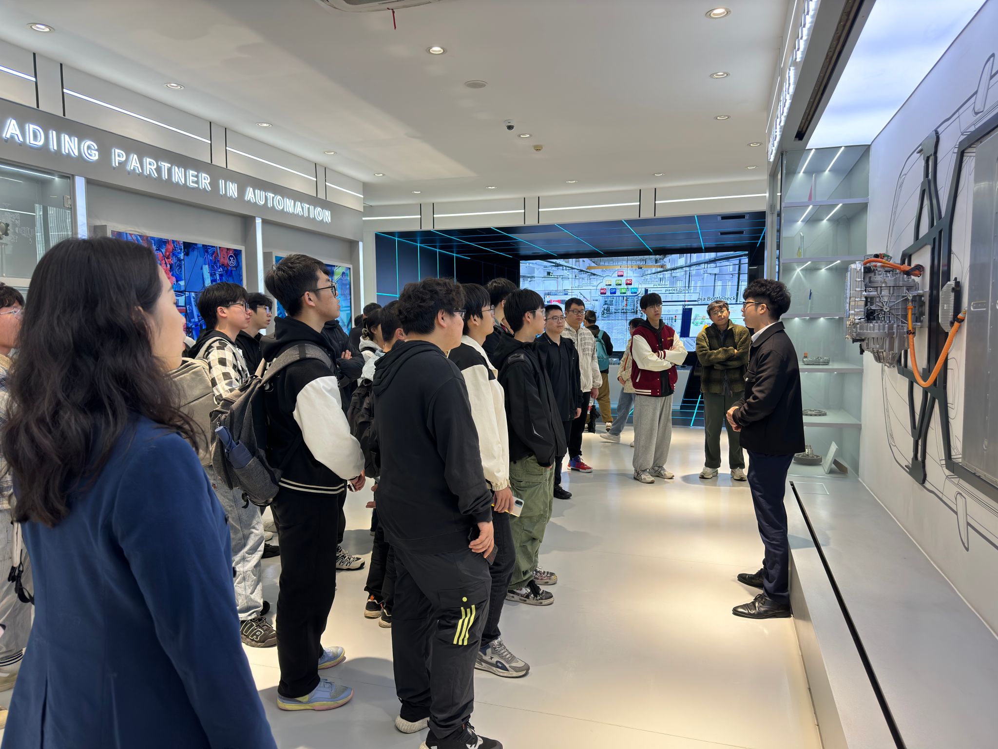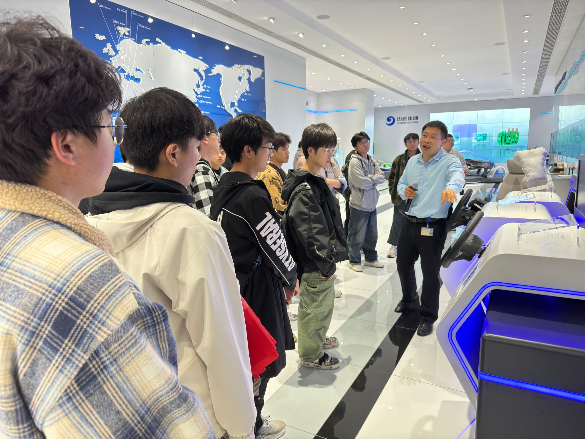 随后,师生们移步至均胜集团展厅,谢炜经理介绍了集团的发展历史、经营理念、产品结构以及未来发展规划,并期待在校企合作、人才培养、博士后流动站共建等方面与学院能有更多深入的项目。