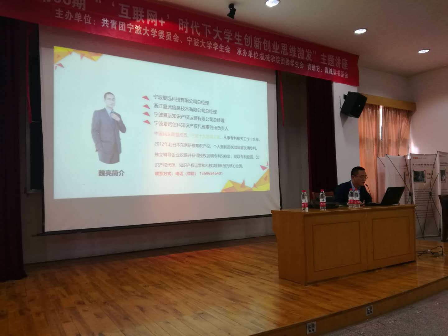 为帮助在校学子树立知识产权保护意识,了解专利申请流程,4月19日下午,宁波大学真诚讲堂第66期“‘互联网+’时代下大学生创新创业思维激发”主题讲座在绣山工程楼三楼报告厅举行。