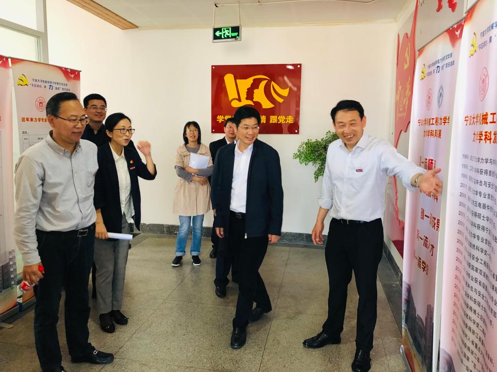4月18日上午,浙江省教育厅党委委员、副书记干武东在宁波市教育局党委书记、局长朱达的陪同下莅临91麻豆参观考察“双带头人”力学教工党支部书记工作室。宁波大学党委书记薛维海、副书记冯志敏、校党委委员张真柱接待了客人一行。