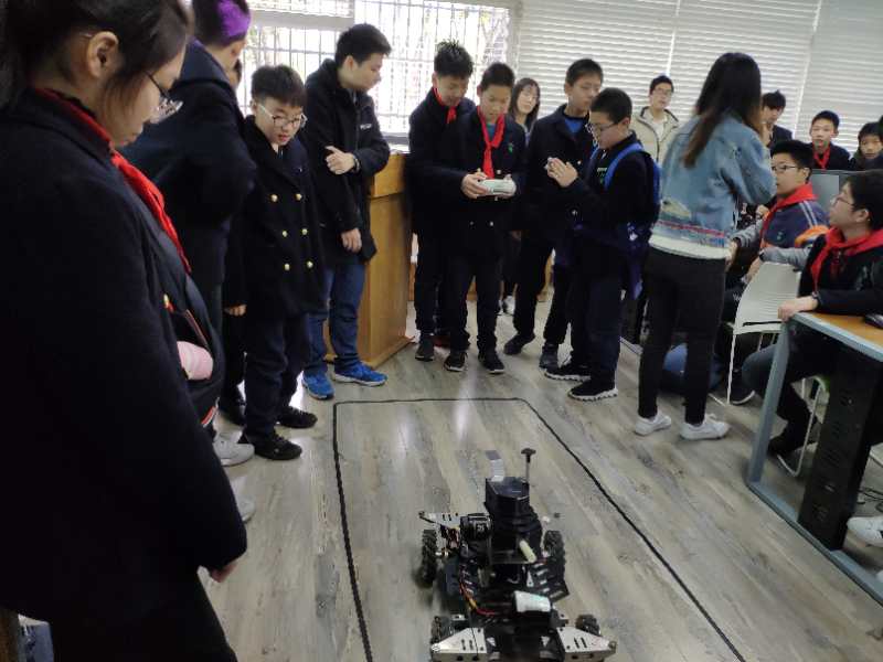 在包玉书三号教学楼111智能车与机器人创新实验室内,社团成员热情接待了82名初一同学及陪同教师们。活动寓教于乐,形式丰富。俱乐部采用视频讲解与提问相结合的方式给同学们介绍了“big dog”、ABB YuMi双臂机器人、波士顿动力机器人、“Atlas”等机器人,在学到机器人种类,功能与原理的同时,积极参与互动的同学们还得到了印有俱乐部战车的明信片与贴纸。小朋友们还依次操作了由实验室“宁波大学隼击战队”自主研发制作的“步兵机器人战车”,体验机械的魅力,感受科技的力量。前来参观的同学们对机器人与实验室充满兴趣,与社员们互动积极,兴致十分高涨。