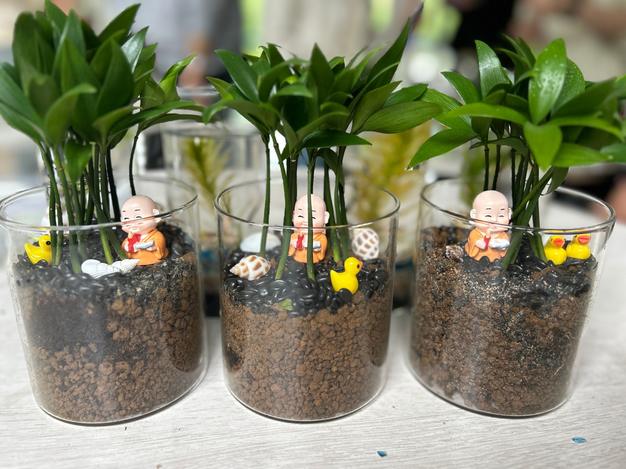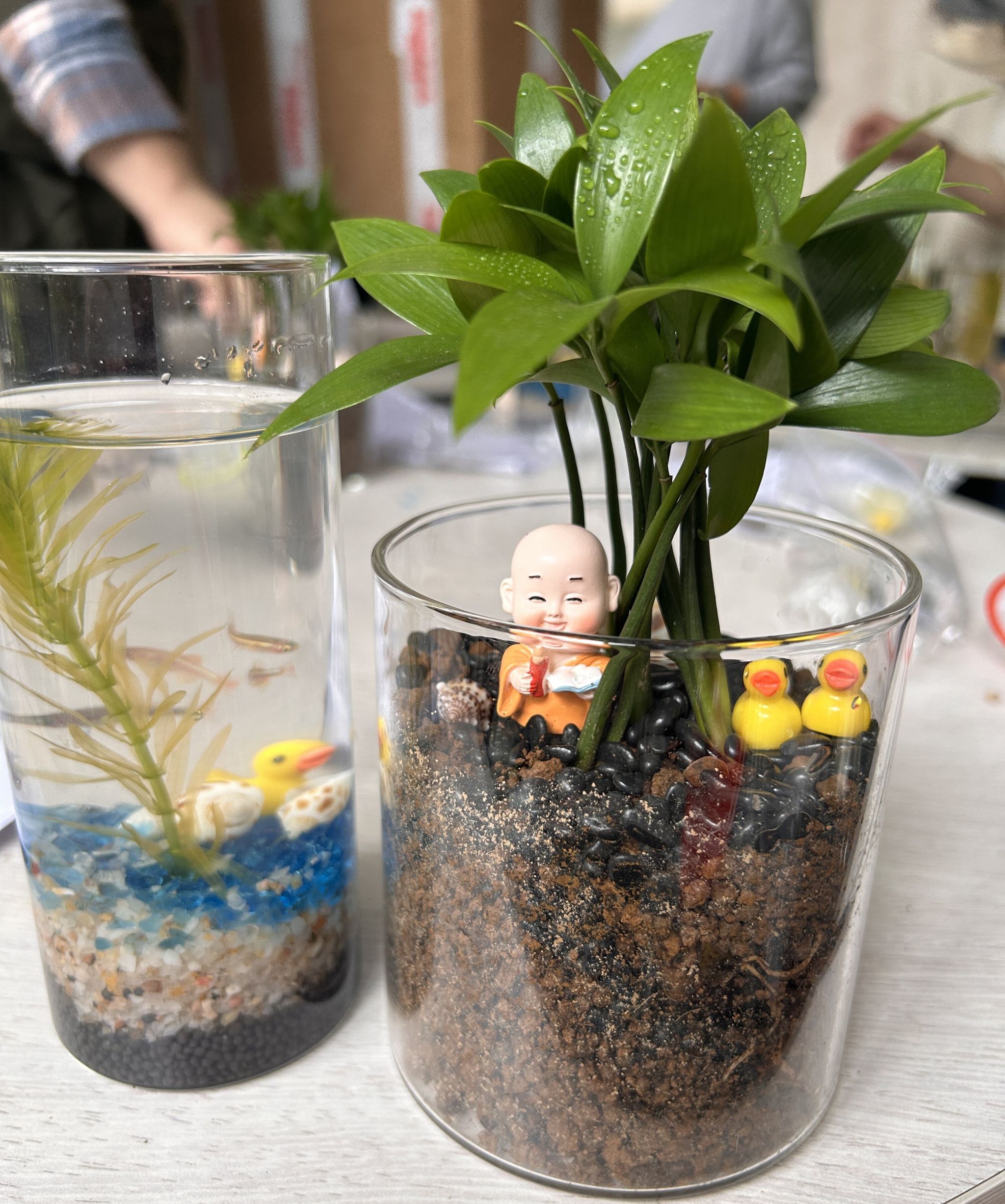 活动现场,大家变身成巧手花匠,从喜好风格出发,力求打造出一个个充满生命力和美感的微观世界。精心布局,动手创作,铺设土壤、种植苔藓、摆放装饰,不一会儿,一盆盆独具匠心、充满生机的微景观生态瓶便呈现在大家眼前。学生们一步步亲手制作生态瓶,了解到生态系统的组成及结构,通过观察其中生物的生活进一步体会它们之间相互依存、相互制约的关系。通过这些作品,学生们不仅展示了自己的才华和创意,也传递了对生命和自然的敬畏与关爱。
