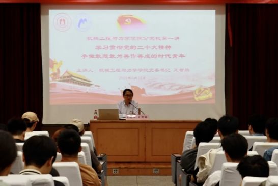 随后,学院党委书记分党校校长王智腾为同学们讲授了党校培训第一课——“学习贯彻党的二十大精神,争做敢想敢为善作善成的时代青年”。党的二十大报告中关于青年的重要论述:“青年强,则国家强。当代中国青年生逢其时,施展才干的舞台无比广阔,实现梦想的前景无比光明。全党要把青年工作作为战略性工作来抓,用党的科学理论武装青年,用党的初心使命感召青年,做青年朋友的知心人、青年工作的热心人、青年群众的引路人。广大青年要坚定不移听党话、跟党走,怀抱梦想又脚踏实地,敢想敢为又善作善成,立志做有理想、敢担当、能吃苦、肯奋斗的新时代好青年,让青春在全面建设社会主义现代化国家的火热实践中绽放绚丽之花。”