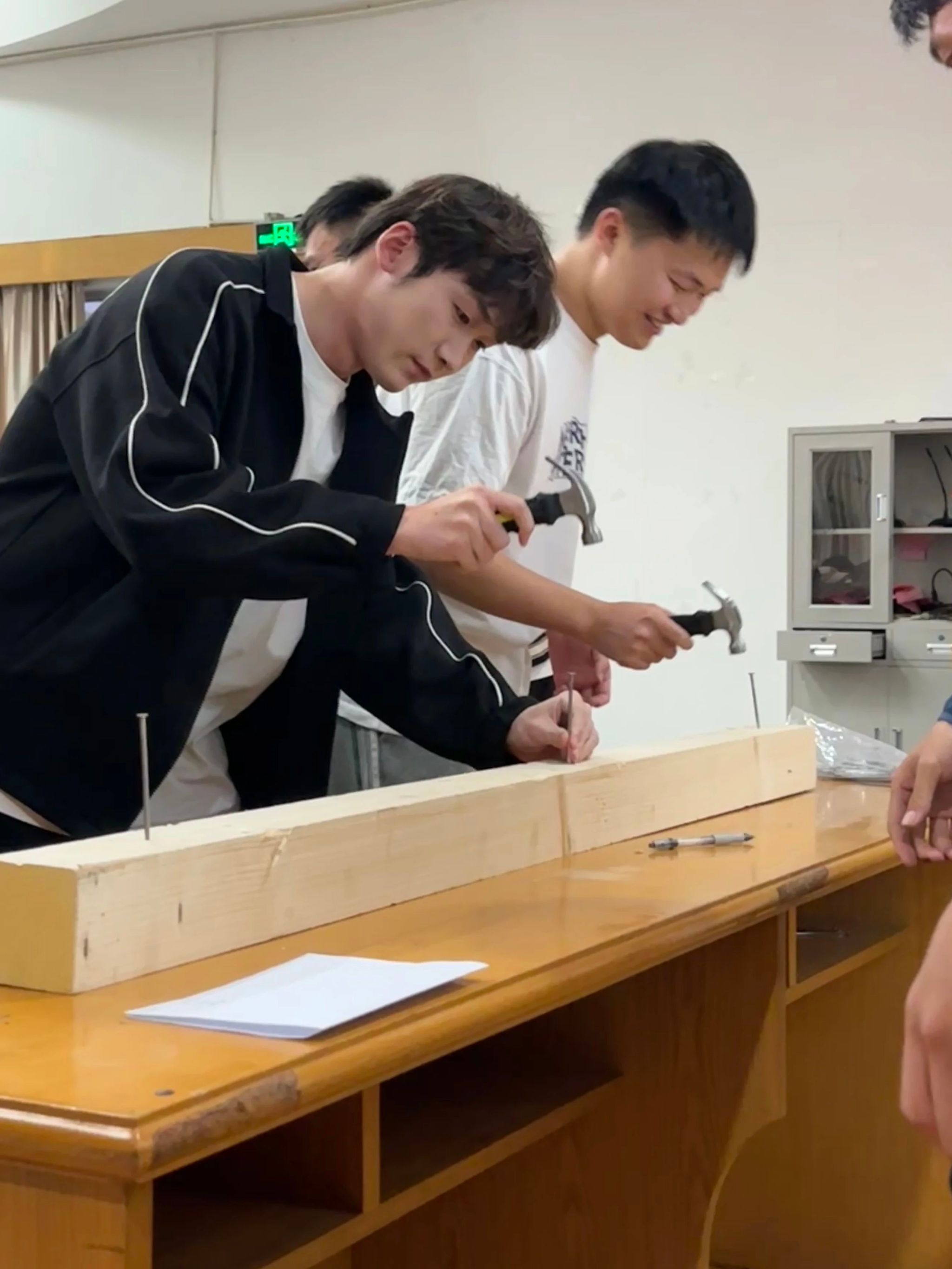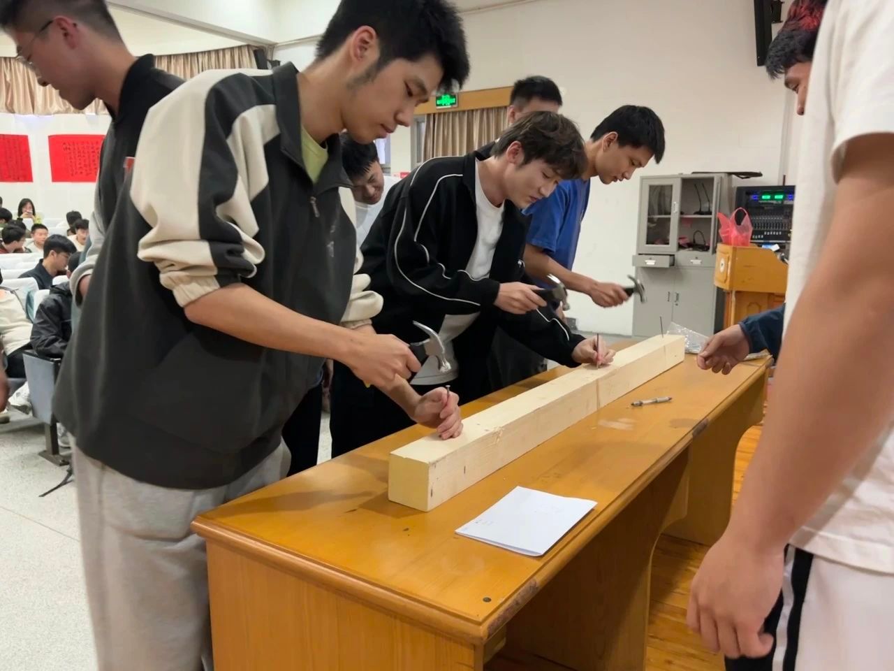 比赛开始,各参赛小组摩拳擦掌,跃跃欲试。随着裁判员一声令下,比赛正式开始。只见选手们手握锤子,全神贯注地盯着木桩,抡起锤子一下又一下地敲击着。他们动作娴熟,节奏明快,敲击声此起彼伏,回荡在报告厅里。