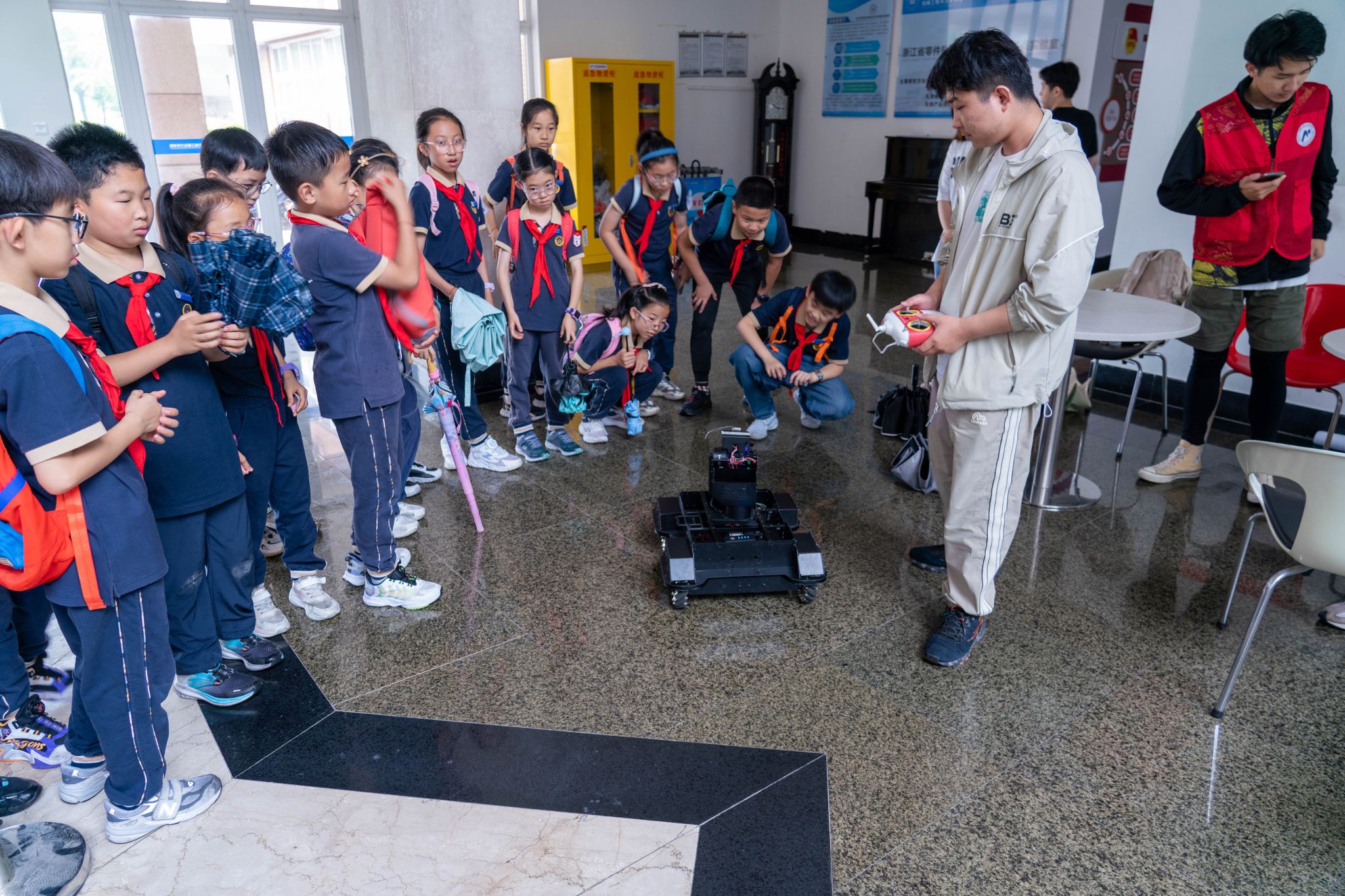 研学之旅的第一站,是21级机械设计制造及其自动化专业的党涛学长带来的科研项目展示——《蜘蛛侦探:一款为复杂环境救援侦测而生的滚爬一体式智能机器人》。他从消防中队的实地考察中汲取灵感,将“蜘蛛侦探”从1.0版本逐步升级至4.0版本,并在现场邀请小朋友们亲身体验这款机器人的自动避障、自动调平、视觉交互等特殊功能。