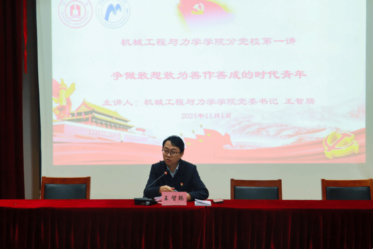 随后,在王智腾书记为全体学员讲授主题为“争做敢想敢为善作善成的时代青年”的党校第一课。他以丰富的经验和生动的实例,为同学们详细阐述了新时代青年应具备的品质和责任。他结合自身经历和同学们身边的真实案例,深入浅出地表达了对同学们的殷切期望。书记强调,同学们要注重并加强理论学习,同时与实际情况紧密结合,不断提升自己,为实现中华民族的伟大复兴贡献力量。