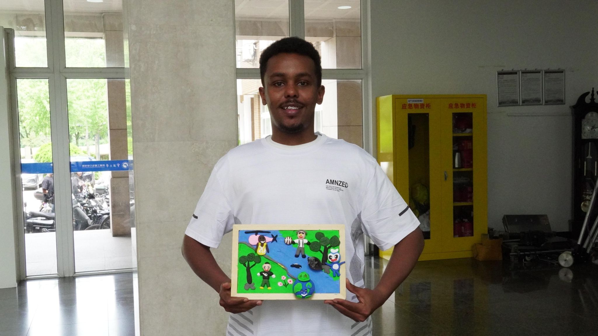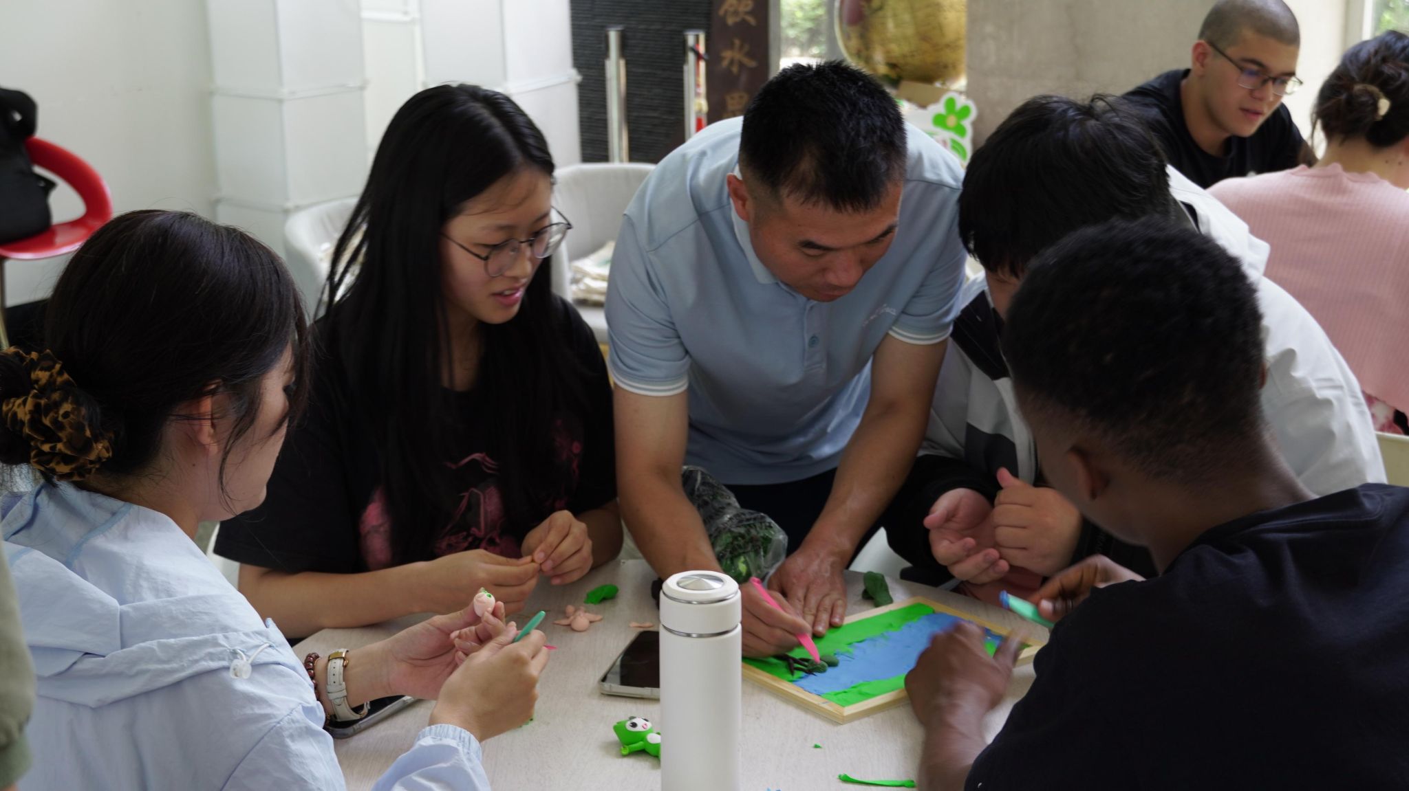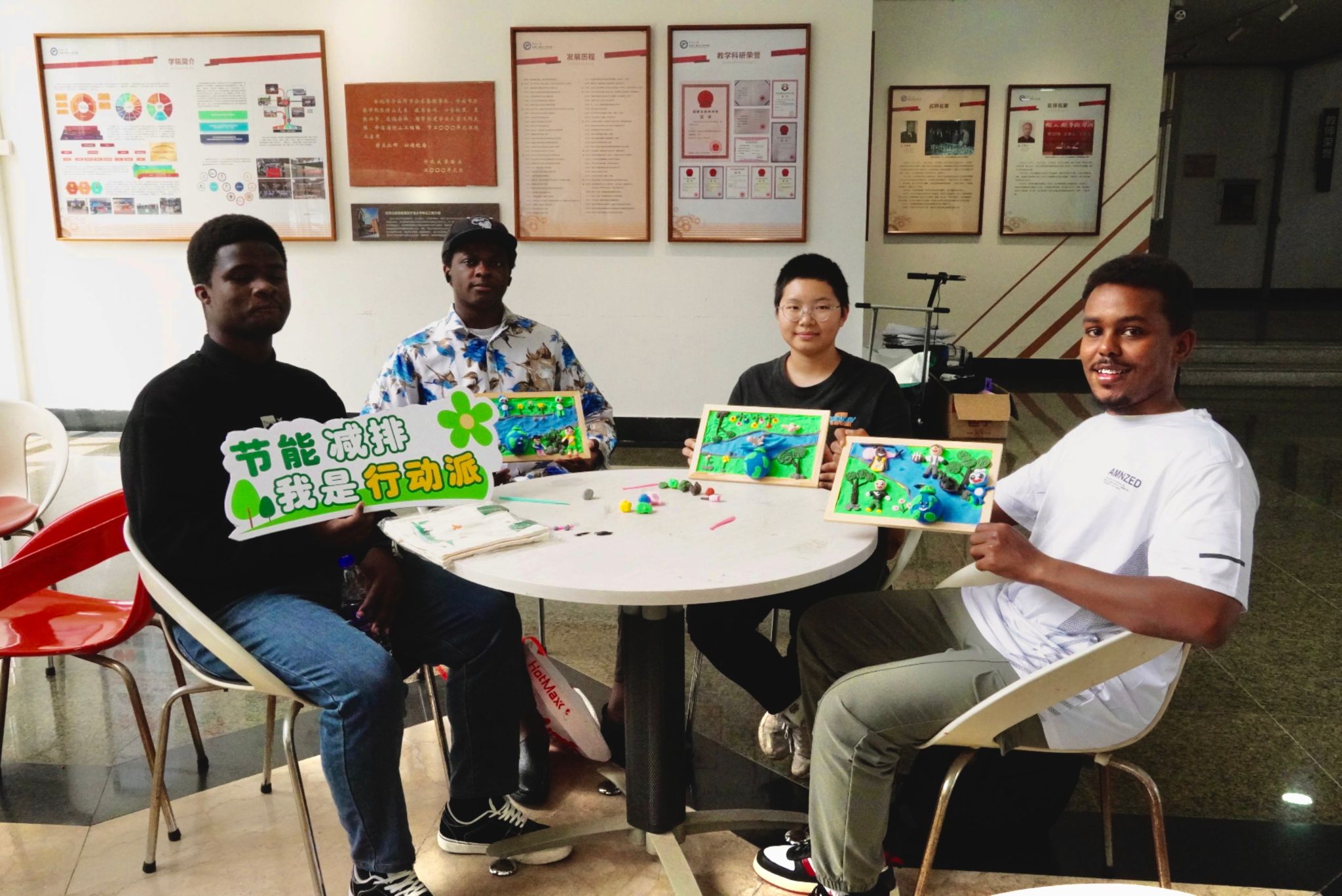 在创作过程中,同学们热情高涨、分工协作,揉捏、塑形,每一道工序都倾注了巧思与心意。面团在指尖流转,一个个寓意深远的环保主题形象逐渐呈现:有象征绿色地球的蓝绿球体,有蜿蜒流淌的河流、苍翠挺拔的树木与绚烂盛放的花朵,也有人与自然和谐共处的温馨场景,形象生动,寓意深刻。国际留学生们也积极参与,与中国学生围坐一桌,热烈交流、互学互鉴,现场不时传来阵阵笑声与赞叹,营造出一幅融合传统技艺与绿色理念的和谐画面。留学生FARID SADIK ISSA现场分享道:“这是我第一次亲手接触中国传统的面塑艺术,没想到它可以和环保理念结合得如此自然。这次活动不仅让我学到了中国的非遗文化,也让我更深刻理解了中国提出的绿色发展理念。我会把这份独特的体验带回家乡,与朋友们分享。”他的发言引起在场师生共鸣,进一步展现了中华优秀传统文化在国际青年群体中的吸引力与影响力。