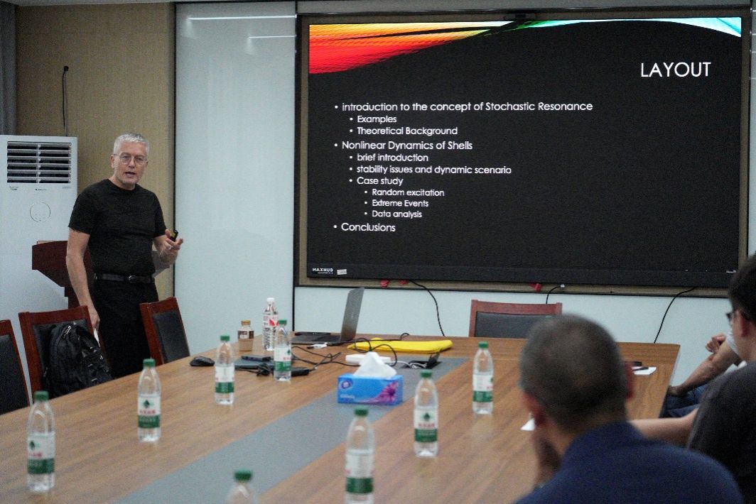 6月11日下午,意大利摩德纳—雷焦·艾米里亚大学Francesco Pellicano教授受邀来访宁波大学极端环境交叉力学研究所,在龙赛理科楼南楼519会议室,为91麻豆师生带来一场题为“Stochastic Resonances”的学术报告。报告由林骥研究员主持,91麻豆相关专业师生积极参与交流学习。 Francesco Pellicano教授从实证与理论双重视角深入浅出地阐述了随机共振的概念。他围绕“简介概述”“稳定性问题和动态场景”及“案例分析”三个部分,重点探讨了壳体的非线性动力学特性。通过实验演示,教授生动展示了壳体结构在不同环境条件下出现的复杂动态现象,并揭示了尖峰振荡的内在规律——其频谱内容与结构自然频率高度匹配,衰减模式亦类似自由结构振荡的瞬态响应。与会师生反响热烈,认为报告内容详实、启发性强。此次报告不仅拓宽了大家的学术视野,也为师生间的交流互动搭建了宝贵平台。(图文:李琼 极端环境交叉力学研究所)