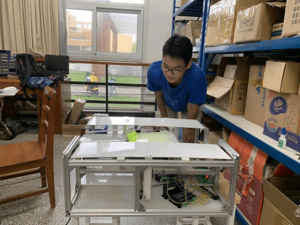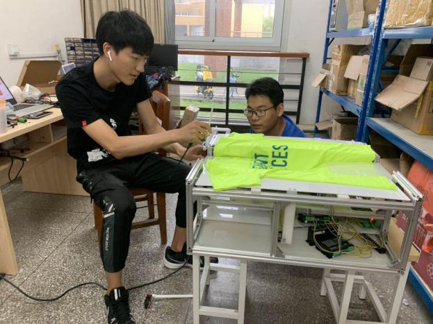 原来,出于自我提升的意愿,本该收拾行囊放假回家的杨玉龙、唐孝迪2位同学,克服种种困难,在家长同意、保证安全的情况下,选择了留在校园跟着徐东明、朱颖达2位老师在学校继续学习“单片机”相关内容。经过一个多月的学习,2位同学迎来了新的机遇与挑战,徐东明老师决定让2位同学跟着本科大二的河远松、大三的唐文君,参加此次机械设计竞赛。2位本科学长负责设计出一款辅助型叠衣机,而杨玉龙、唐孝迪则负责将机器用到的8个电机通过2个按钮,实现各种设计的功能。